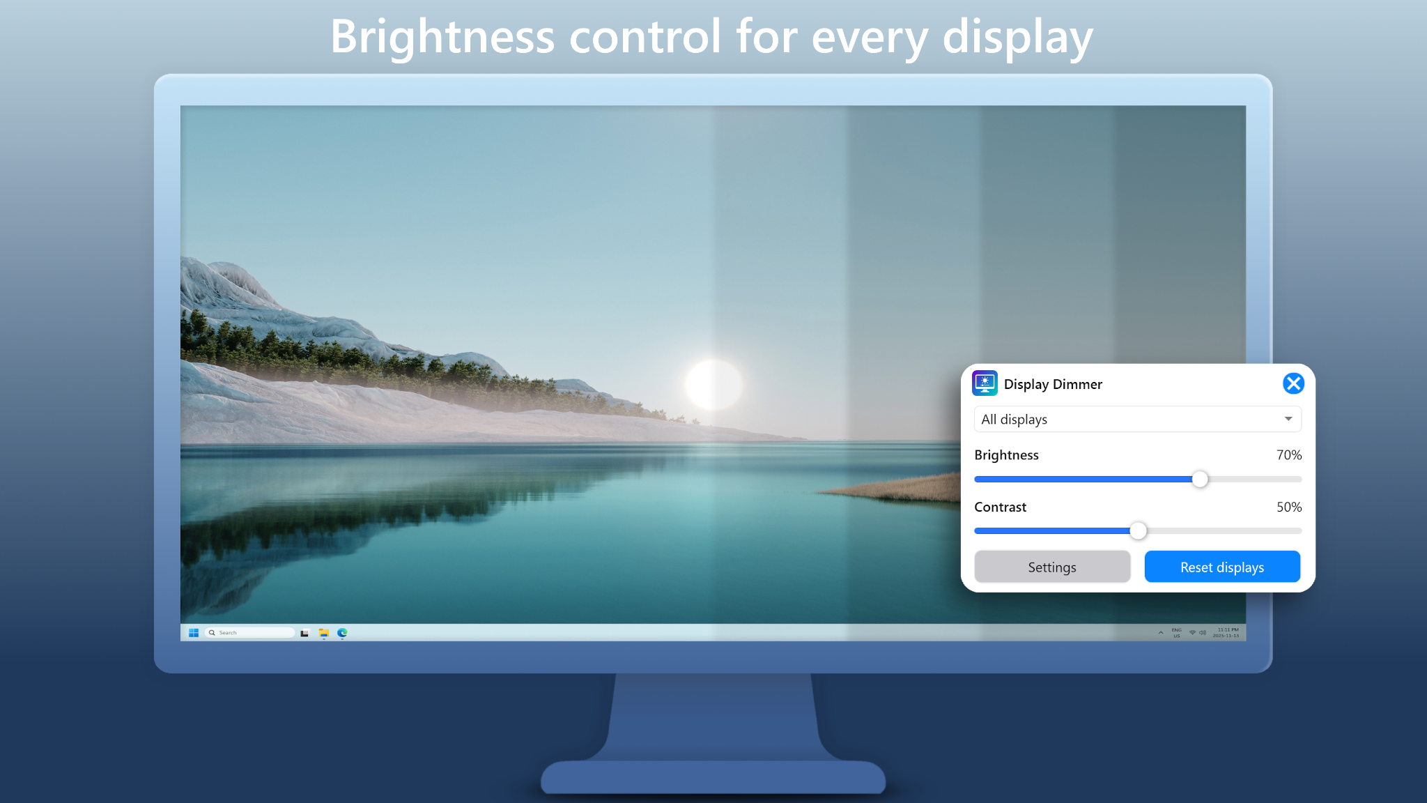 Display Dimmer is a lightweight, native Windows app for external monitor brightness control. It uses DDC/CI when supported, with a safe GPU dimming fallback for monitors that don’t behave well with hardware control.